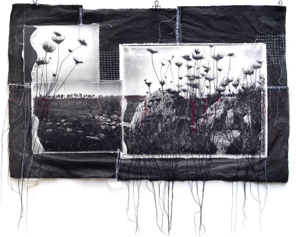 The work does not end at the moment of development. We continue it by hand: stitching across the surface of the print, applying earth and pigment, introducing calligraphy into the space of the frame. This is not a commentary on the image. It is an attempt to give it a voice — to find the sound or rhythm that already exists within the frame, but has not yet been heard.